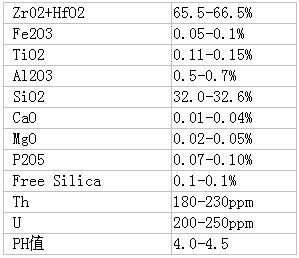 保证值 Zr02+HfO2:65.5-66.5%,Fe2O3 :0.05-0.1%。