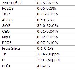 保证值 Zr02+HfO2:65.5-66.5%,Fe2O3 :0.05-0.1%。
